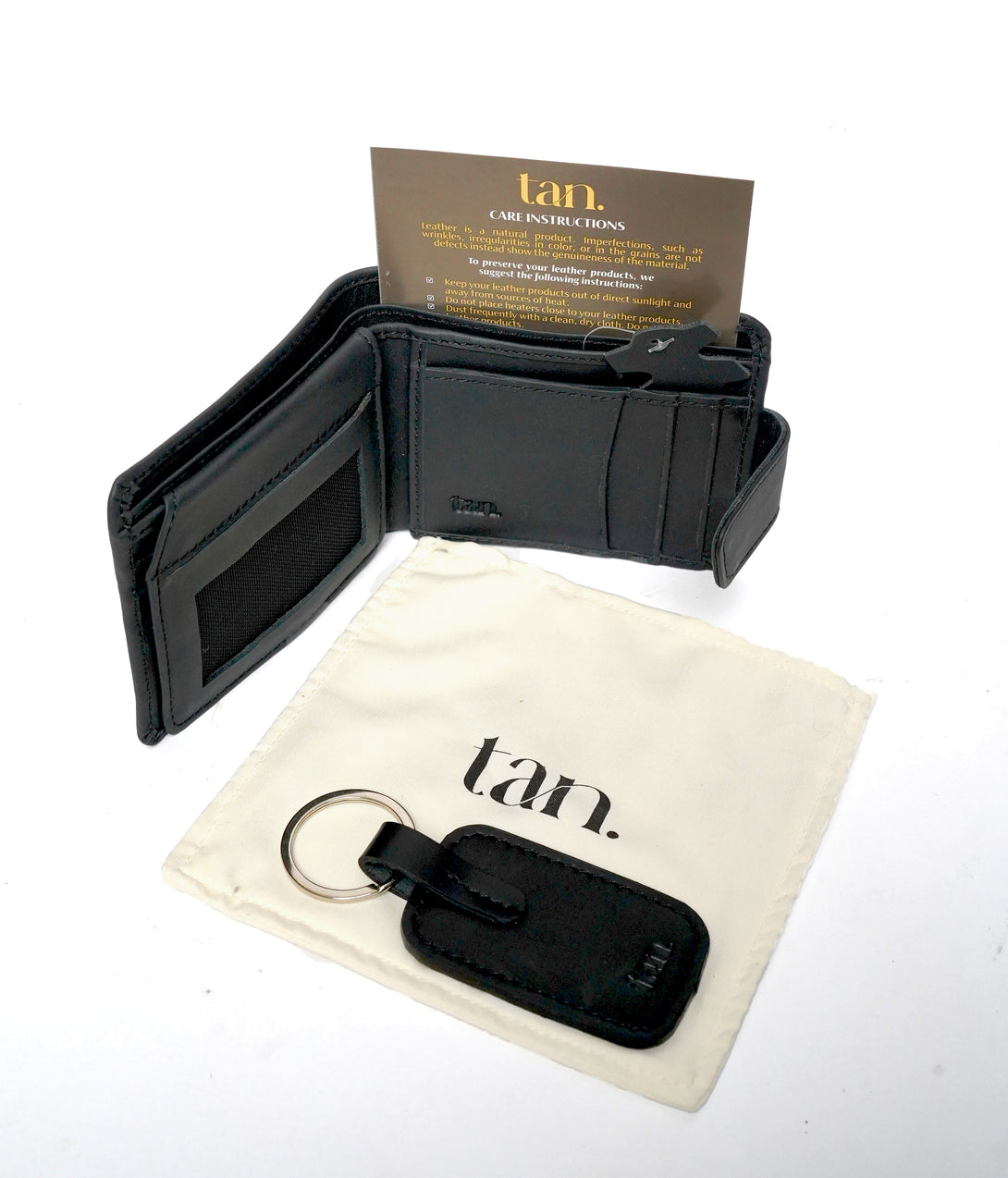 Refined and ready to gift, the Noir set pairs a sleek black bi-fold wallet with a matching keychain, both crafted for style and everyday function. The wallet features a matte finish with a secure button buckle, offering a smart balance of elegance and practicality. Thoughtfully packaged in a signature tan. gift box — a perfect gesture of understated luxury.