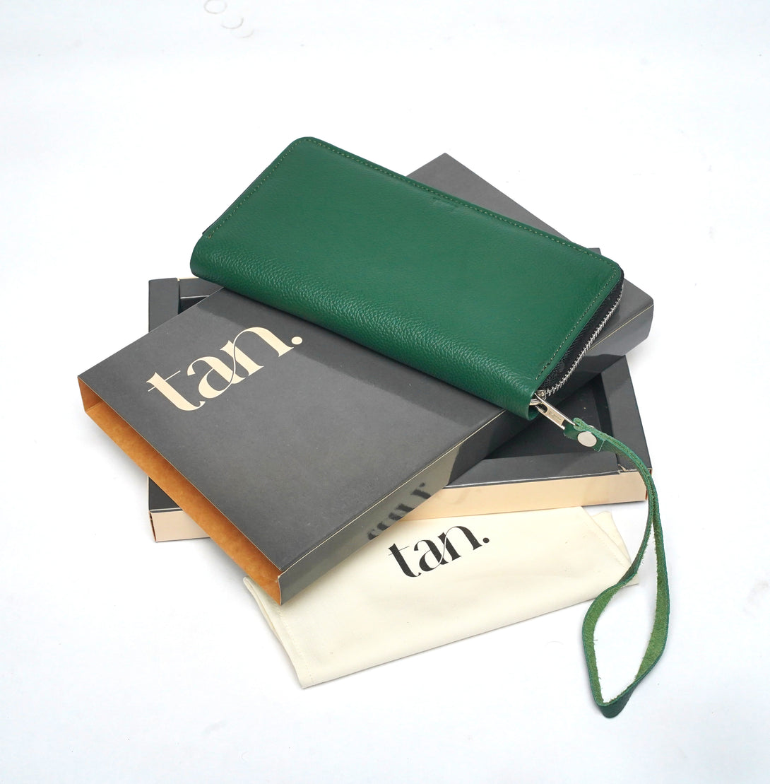 Bold yet graceful, Selene is a zip-around wallet crafted from premium emerald green leather. Its sleek design features a smooth, full-length zip for secure storage and effortless access. A perfect balance of elegance and everyday function, delivered in a signature tan. gift box — ideal for gifting or treating yourself.