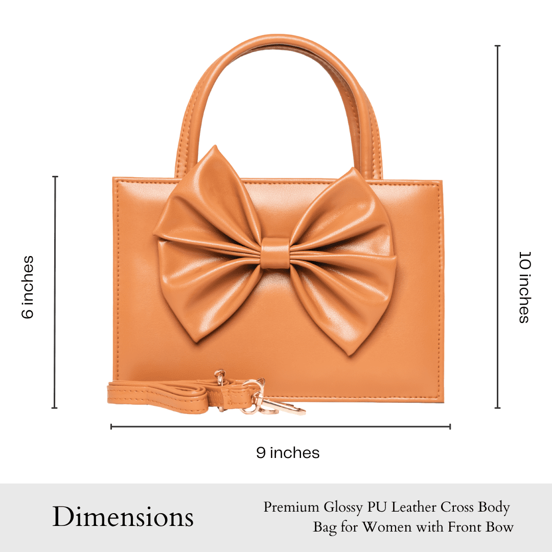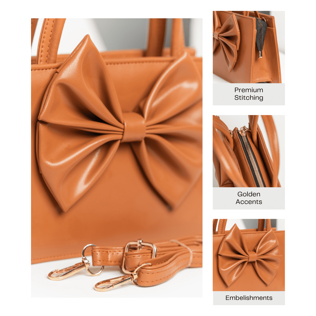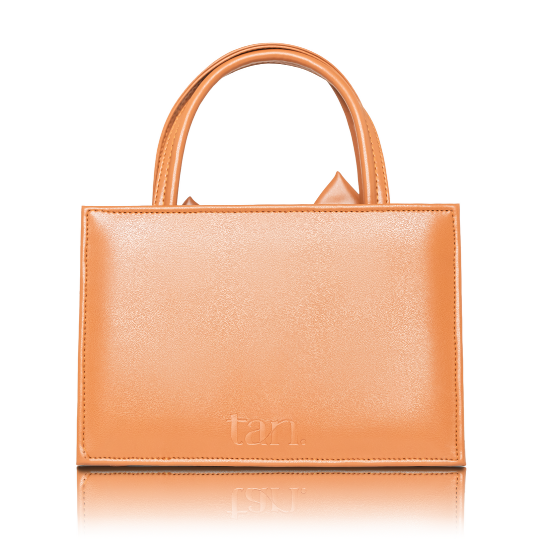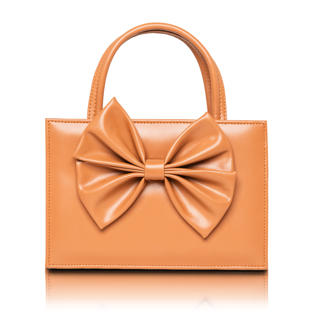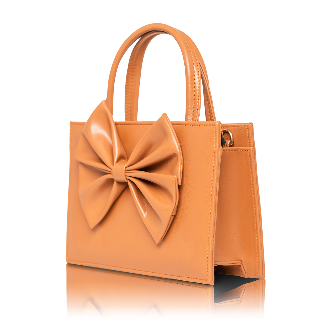 Playful elegance takes form in the Velora Mini Handbag by tan. With its striking front bow and glossy camel finish, Velora brings a touch of charm and confidence to any look. The structured design and compact silhouette make it a statement piece that transitions seamlessly from day to night.